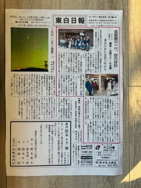 10/25(土)福神規子先生と共に、天野会長を筆頭に俳句の会有志&令夫人たち10名が福島県南2町を吟行。時期早々で真っ赤な紅葉は望めませんでしたが、秋の奥久慈日帰りバスの旅を堪能しました。「白河の関にかかりて旅ごころ定まりぬ」と、俳人・松尾芭蕉が白河の関を越える旅に思いを馳せたように、東北新幹線で新白河駅集合。築城400年を祝う棚倉町大名行列+矢祭町の古民家にオープンした「虫の里・福島奥久慈昆虫館」を訪問。矢祭町長が所属する茨城県大子RCとバナー交換もしました。ちなみに、棚倉町は当会員・矢崎潤子の故郷、矢祭町は矢崎が町おこしで発起人となった昆虫館。友情に涙。