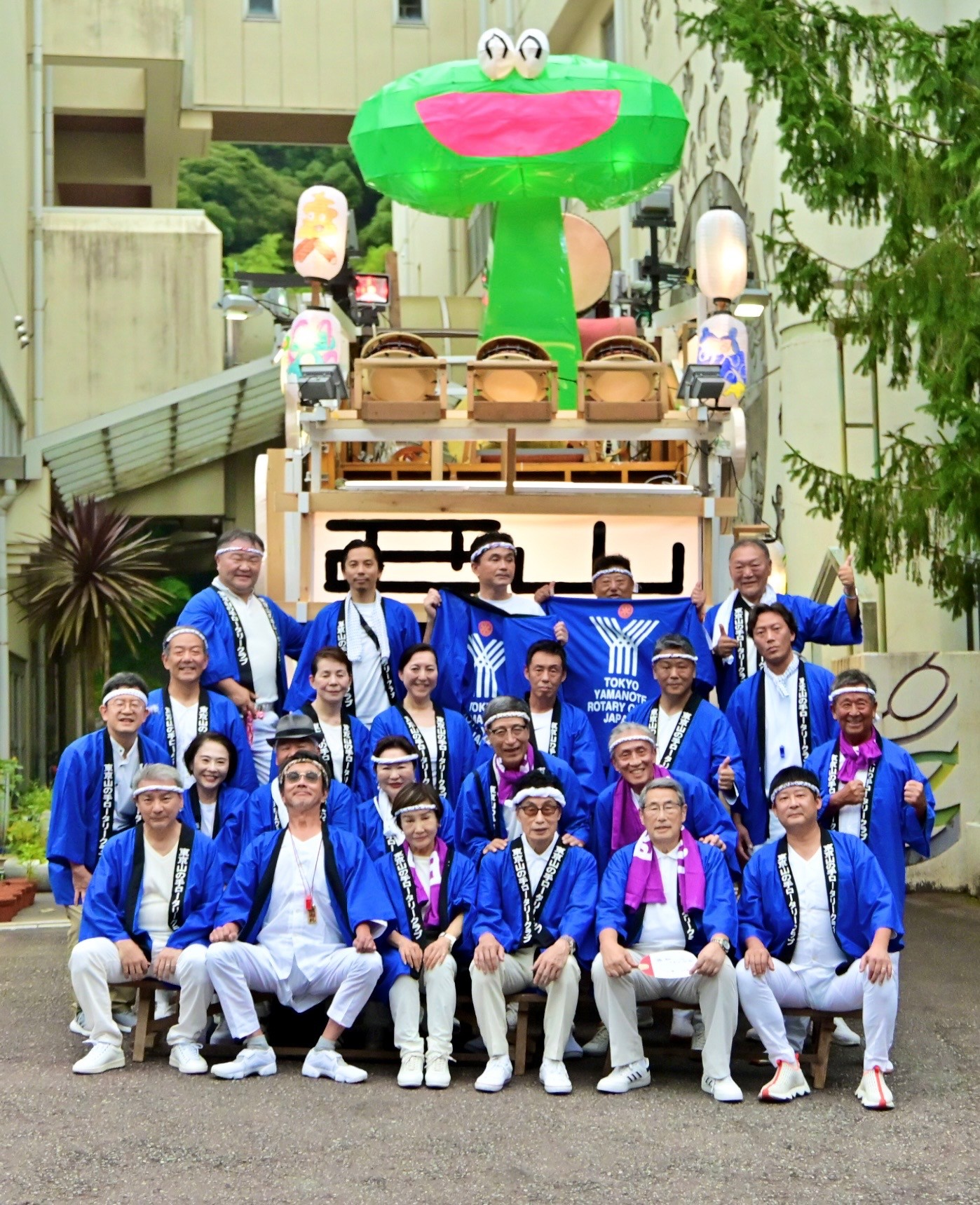 デザインが刷新された熱海西山町の山車の綱を、障害者と保護者の方、施設の方約40名、ロータリアン約45名、西山町の方約40名の大勢で引き、「どっこい、どっこい」とお囃子に合わせて大声で盛り上げました。山車の先頭には大きなクジラのバルーンが泳ぎ、山車の後ろまで全長約40メートル、参加した山車では断トツの隊列の長さでした。